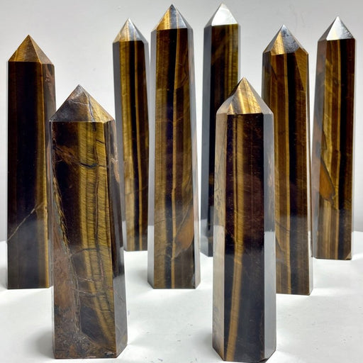 CRYSTALS WHOLESALE CENTERIn stockMaterial: Tiger Eye.High: approximately 6.5-10.6in(16.6-27cm).Width: approximately 1.7in(4.5cm).Total: 6kg(13.2lbs). 8pcs.Color: as the picture.Qua...