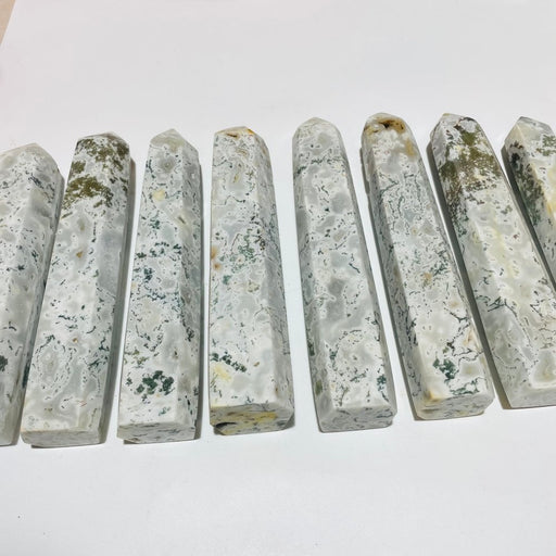 CRYSTALS WHOLESALE USAIn stockMaterial: Moss Agate.Tall: approximately 8.2-11.6in(21-29.5cm).Width: approximately 1.7-2.1in(4.5-5.5cm).Total Weight: 6.5kg(14.3lbs). 8pcs.Color: ...